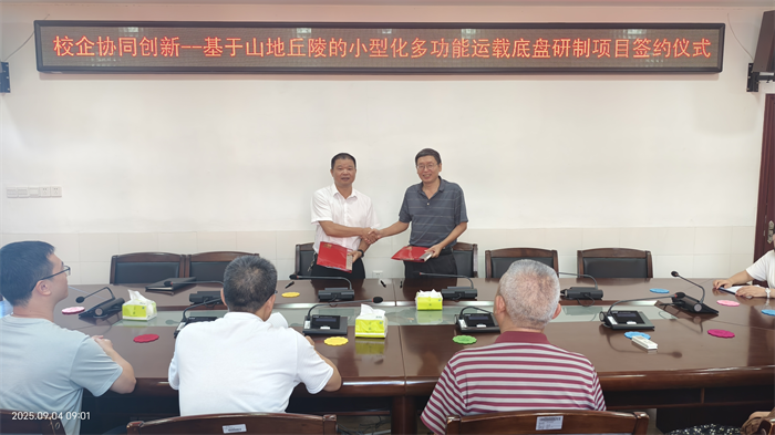 9月4日,三明市农业学校与福建智辰智能农业装备有限公司就 “基于山地丘陵的小型化多功能运载底盘研制项目” 举行签约仪式。福建智辰技术总工严积森、三明市农业学校校长陈文优、副校长谢阳军、胡安生,以及双方项目骨干团队成员共同出席仪式。